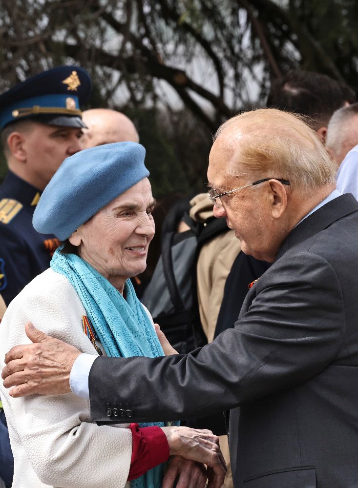 После минуты молчания и скорбного стука метронома от имени Совета ветеранов войны и труда МГУ с наступающим Днем Победы людей Московского университета поздравили малолетний узник фашистских лагерей, профессор механико-математического факультета Виктор Яковлевич Шкадов и студент исторического факультета Тимур Усманов.